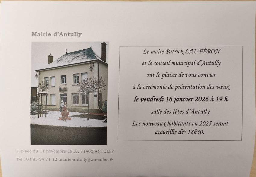 La cérémonie des voeux du Maire aura lieu le 16 janvier 2026 à 19h00 à la salle des fêtes d'Antully. Les nouveaux habitants sont conviées à 18h30.